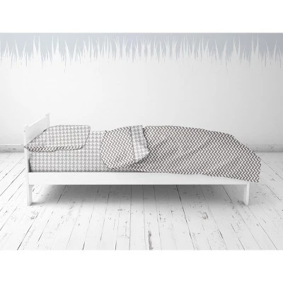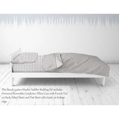 - This Bacati 4-piece Muslin Toddler Bedding Set Set Includes Reversible Oversize Comforter (42 x 55 inches), Toddler Bed Fitted Sheet(52 x 28 x 6 inches), Toddler Bed Flat Sheet(52 x 42 inches) which is fitted at the bottom to make the bed easily and Standard Pillow Case (20 x 25 inches) with french ties on the back in fun, colorful and signature prints in 100 percent cotton Muslin fabrics. Designed in United States by Experienced Designers. Many coordinating items available to purchase separately in this Bacati Muslin Bedding Collection.